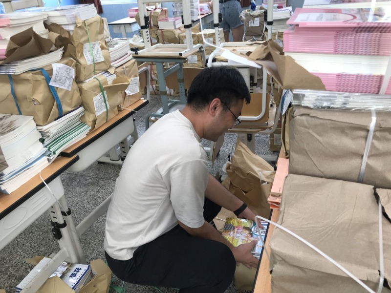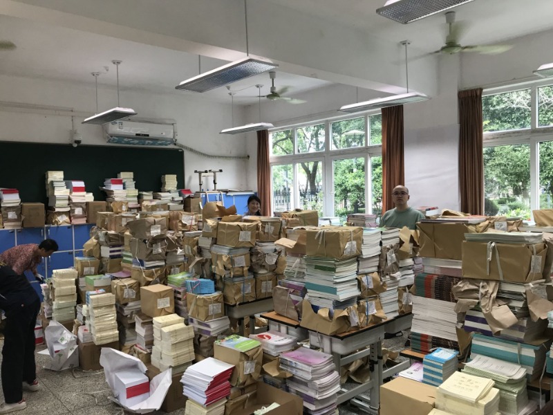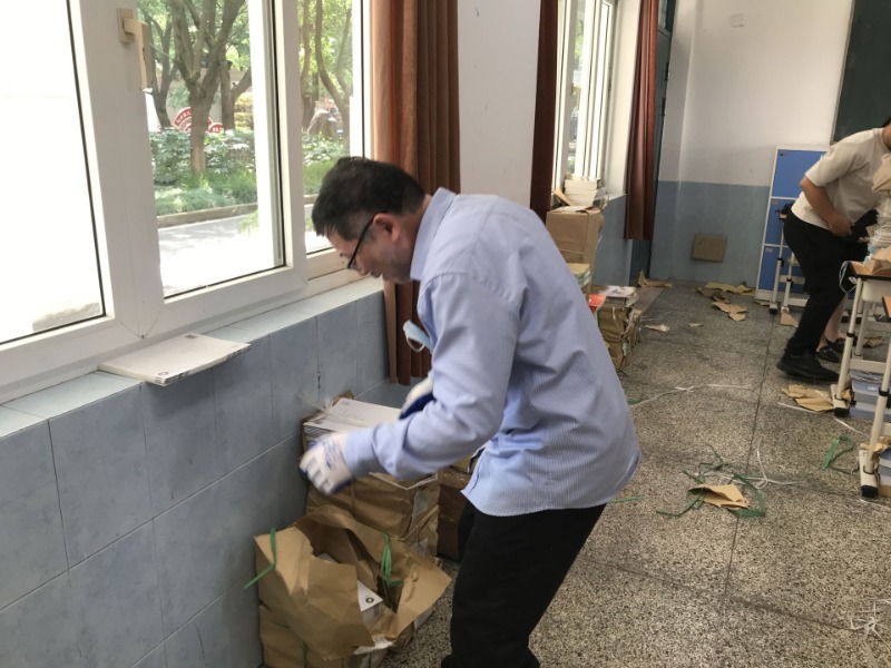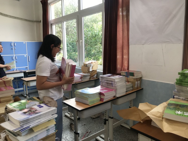 全体党员和后勤人员分工、分组在图书管理员的指导下,根据年级各班人数,分门别类将教材摆放整齐,面对高温天气,高强度工作都毫无怨言,搬书、分类,动作干净麻利。教室里忙碌的身影,浸透汗水的衣背,展现着党员、后勤老师们的辛劳。但是看着整齐的新教材,想到新学期同学们更方便领取,大家脸上都洋溢着笑容。
