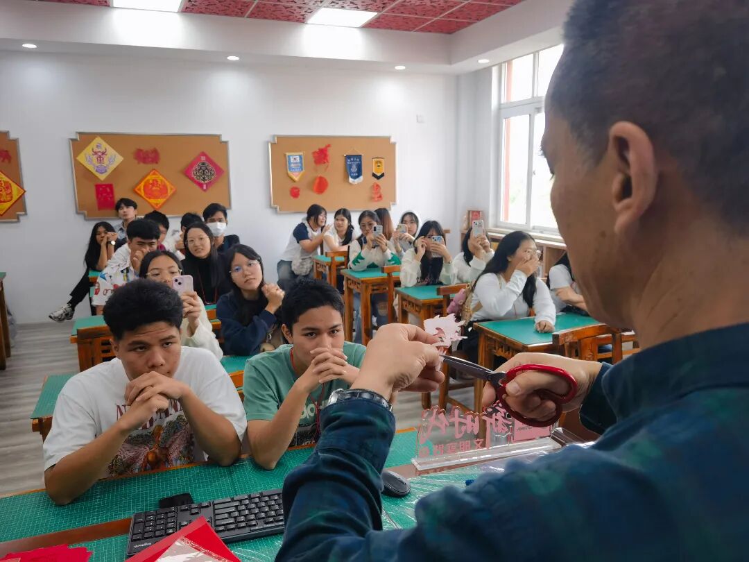 最后,师生们来到了剪纸艺术展览馆,观摩了爱廊园师生的剪纸作品。杨老师现场介绍了剪纸艺术的起源、技巧和意义,还亲自演示了“花开五福”的剪纸过程,并将“花开五福”送给泰国师生,赢得了泰国师生的阵阵掌声。
