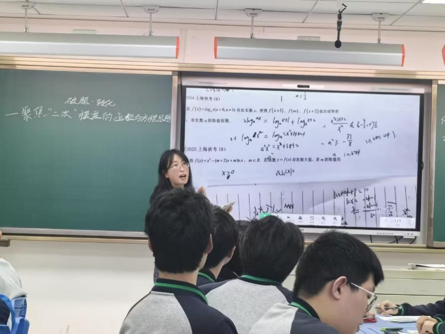 首先上海师范大学第二附属中学江文娟老师开设了一节高三复习课《破题•转化——聚焦“二次”模型的函数与方程思想》。江老师带领学生观察了近三年上海高考函数真题的分类统计,让学生意识到函数板块的重要性,激发了学习的兴趣。然后江老师以2023年上海秋季高考18题为例,紧扣“破题与转化”主线,系统梳理了函数、方程、不等式三者的转化逻辑,重点突破含参“二次”模型综合应用这一复习难点,落实新课标对数学核心素养的要求。在教学过程中,江老师能够启发学生一题多解,及时地了解学生的学习情况,并进行实时干预,有效地提升了教学效率。