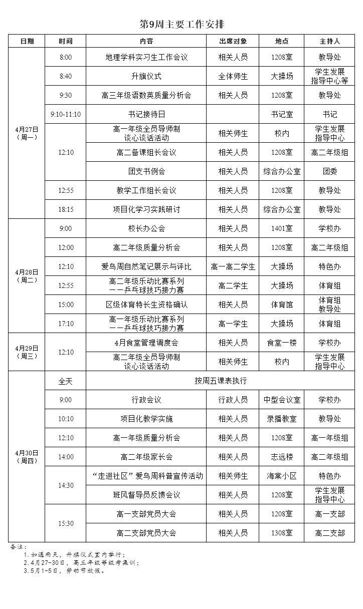 第九周主要工作安排