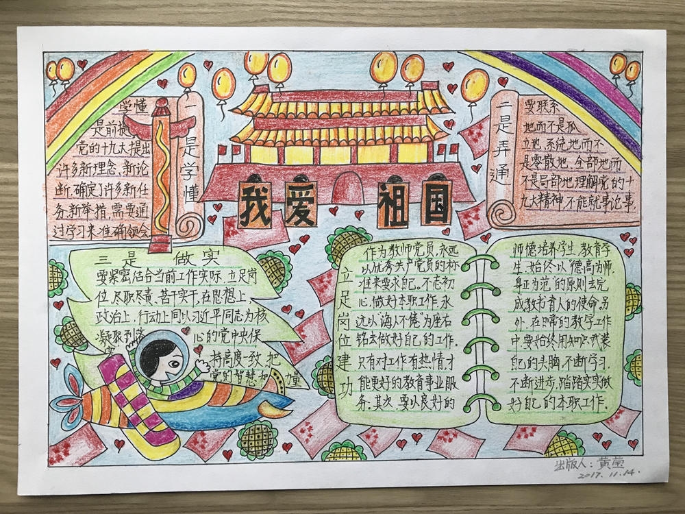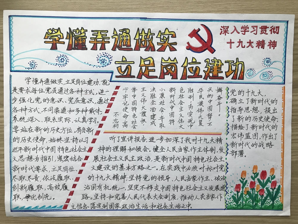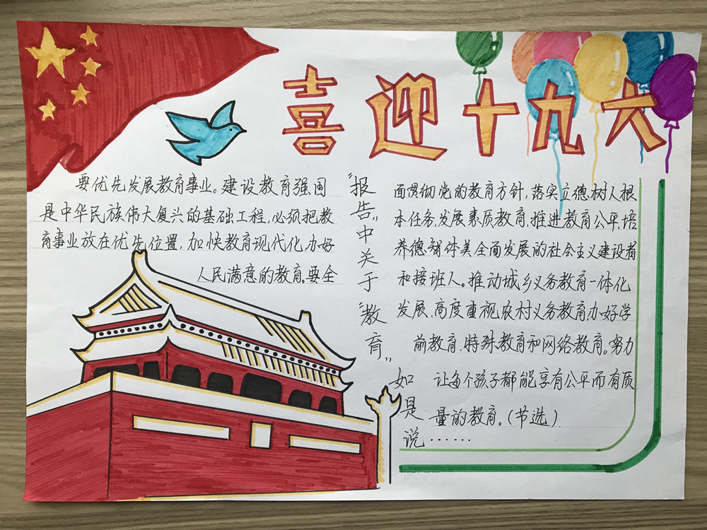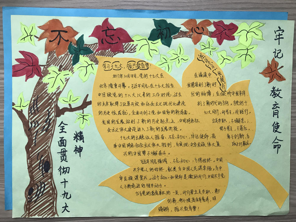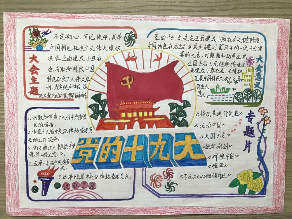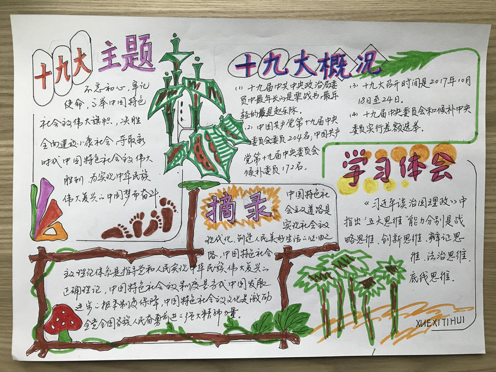 为了认真学习宣传贯彻党的十九大精神,学校党支部组织开展“学懂弄通做实 立足岗位建功——学习十九大精神手绘小报”活动,活动目的:1、深刻领会党的十九大精神内涵和实质,把思想和行动统一到党的十九大精神上来,进一步凝聚力量、推动工作。2、落实多种形式宣讲十九大精神,营造学习宣传贯彻十九大精神的浓厚氛围。小报内容要求:健康向上,版面布局合理、活泼新颖,形式生动活泼、图文并茂、整洁美观。经评委评比,赵玉等8名党员作品获一等奖、曹慧蔚等10名党员作品获二等奖、章历康等14名党员作品获三等奖。