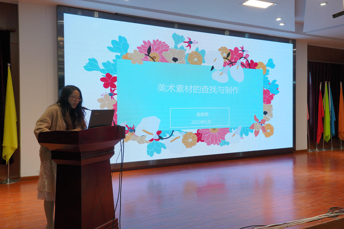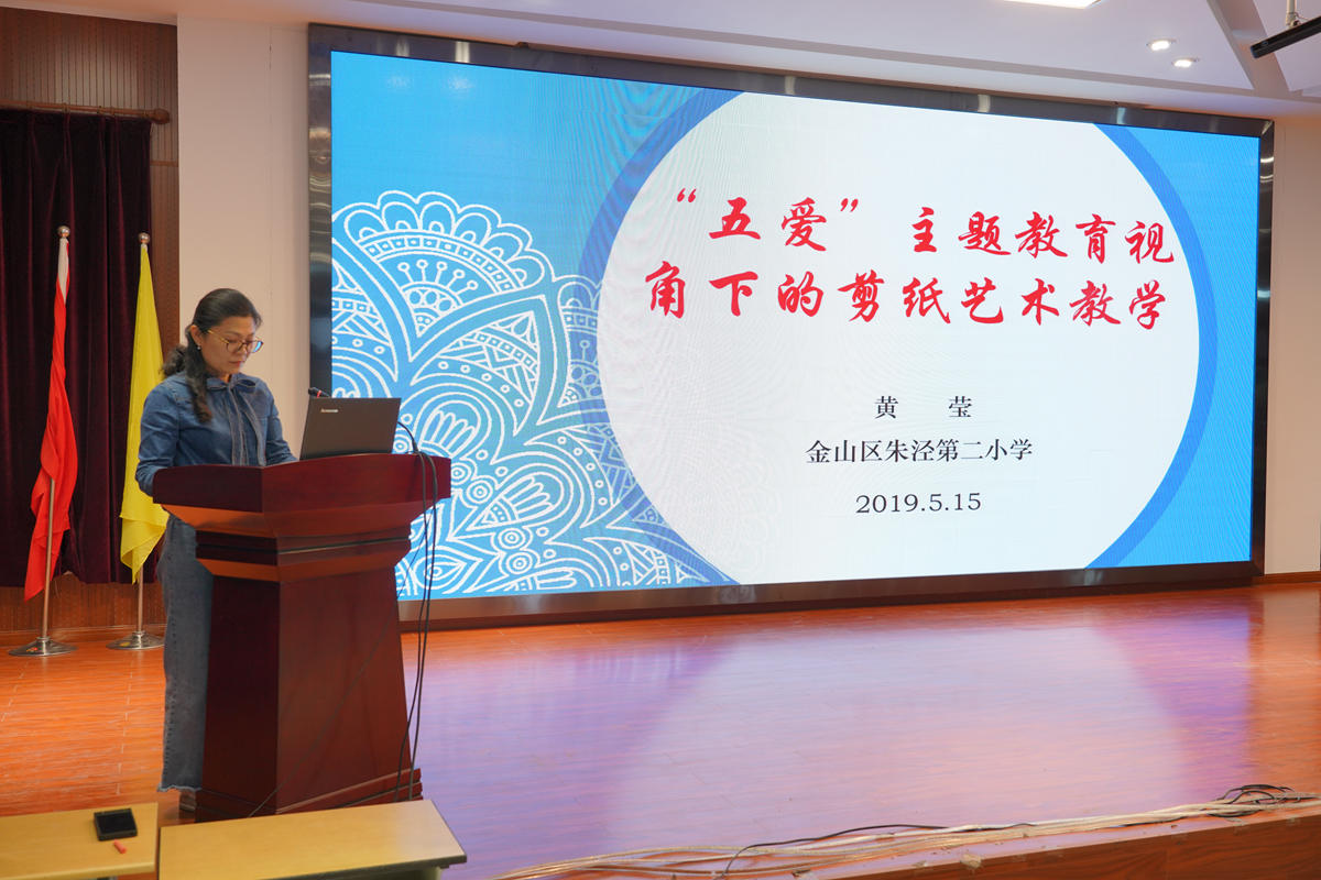 接着,黄莹老师做了《五爱”主题教育视角下的剪纸艺术教学》的微报告,黄老师从融入五爱主题,完善剪纸课程;结合多元评价,突显德育作用;研发校本课程,提升教研能力,三方面来阐述如何将校本课程《剪纸艺术》与《爱无痕》相互融合。然后,金卫小学周君英老师做了《美术素材的查找与制作》的微报告。周老师教会我们如何做身边的有心人,通过日常的积累,分享寻找美术素材的途径与视频剪辑的方法。用信息技术提升美术课堂教学质量。