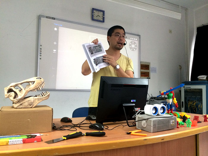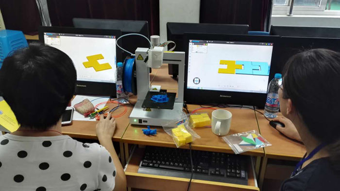 下午12:30培训准时开始,先由来自北京的何贝勒老师用影片的方式为大家介绍3D打印的历史和原理。接着何老师用几个生动有趣的小实验让大家区别ABS和PLA两种材料的特点。然后以机器人模型为例,教大家如何使用up切片软件及打印机。最后为大家讲解如何用3D设计软件进行数学教学。继何老师的课后,由龚鹏飞老师给大家讲解如何用3D软件进行生物教学。