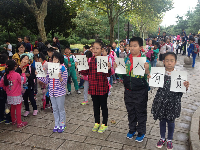 10月15日,朱泾二小组织学生到上海野生动物园进行社会实践活动。活动前,同学们认真书写宣传标语“保护动物 人人有责”。活动时,同学们高举标语,向游客进行宣传。