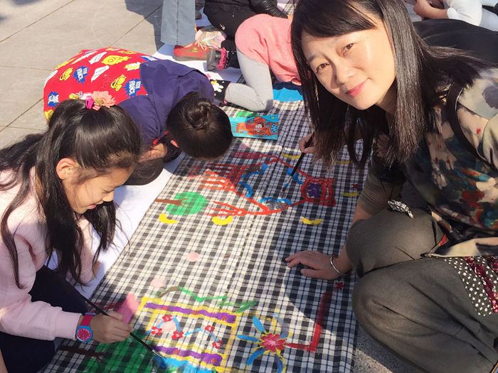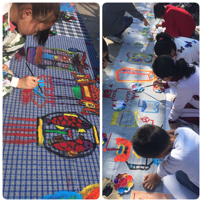 在长卷绘画活动中,60对朱泾二小亲子家庭在我校阮国红老师的指导下在长长的百米土布长卷上用画笔留下了一个个美丽的花灯印迹。五彩斑斓的花灯与土花布相结合,酝酿出浓浓的民俗气息。
