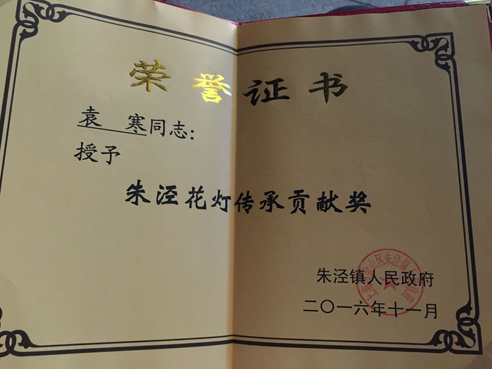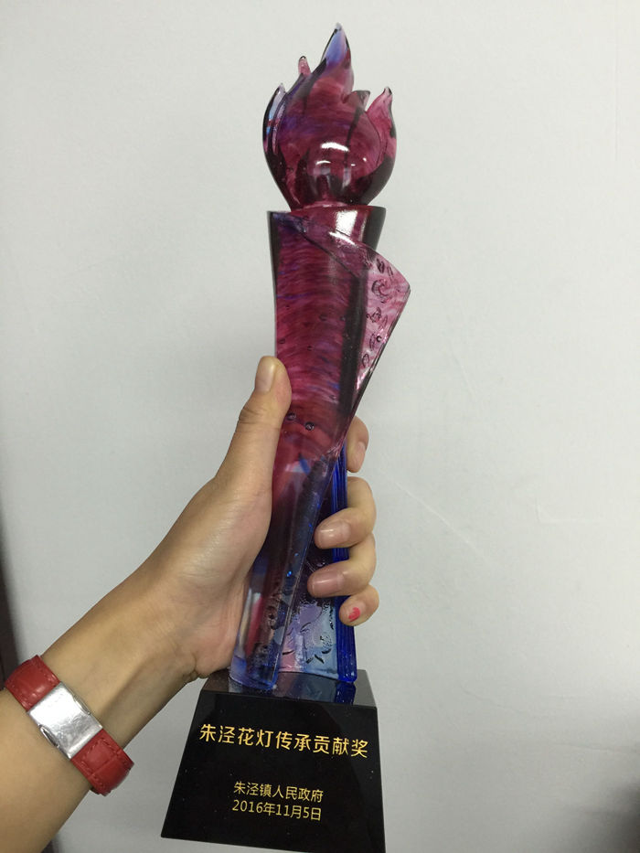 夜晚的新农社区文化广场又变了一个样,绚丽的灯光让广场上的民俗氛围更浓郁了,这里将要举行的是“人家槺咯闹花灯”——朱泾花灯节颁奖典礼文艺演出。在今年的花灯节颁奖典礼上朱泾第二小学与我校的袁寒老师荣获了朱泾花灯传承贡献奖,精美的奖杯与奖状寓意着我校花灯课程的再次成长得到了肯定。