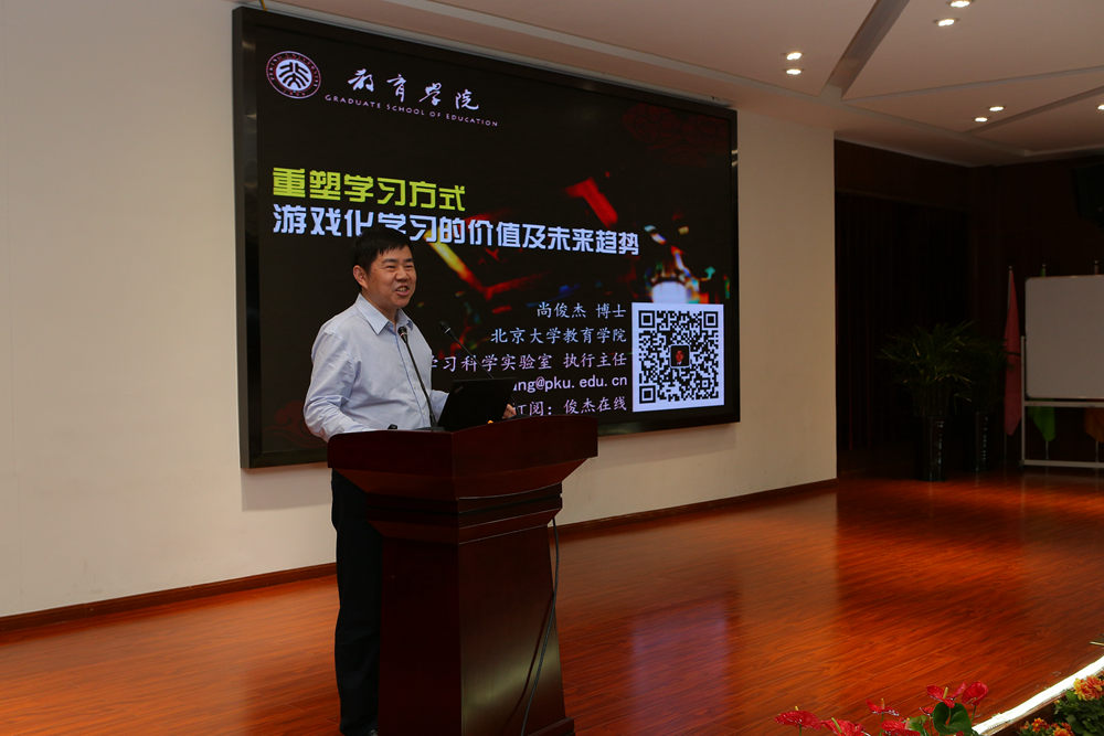茶歇片刻,全国游戏专业委员会主席尚俊杰教授作了主题为《游戏化学习的价值和未来发展趋势》的微报告,从游戏动机、游戏思维和游戏精神三个方面探讨了游戏化学习的价值,并从信息技术层面预测未来游戏化学习的发展趋势。