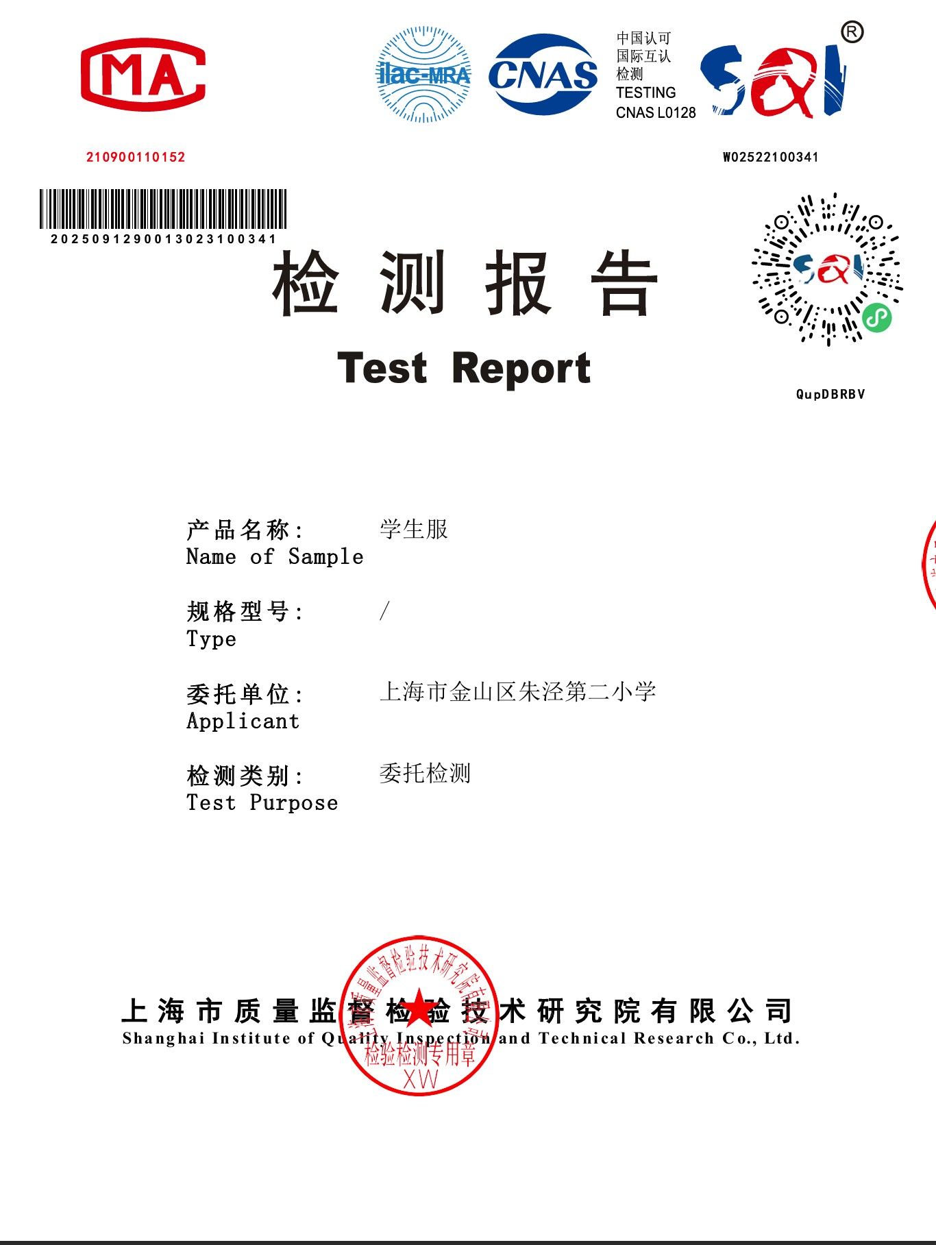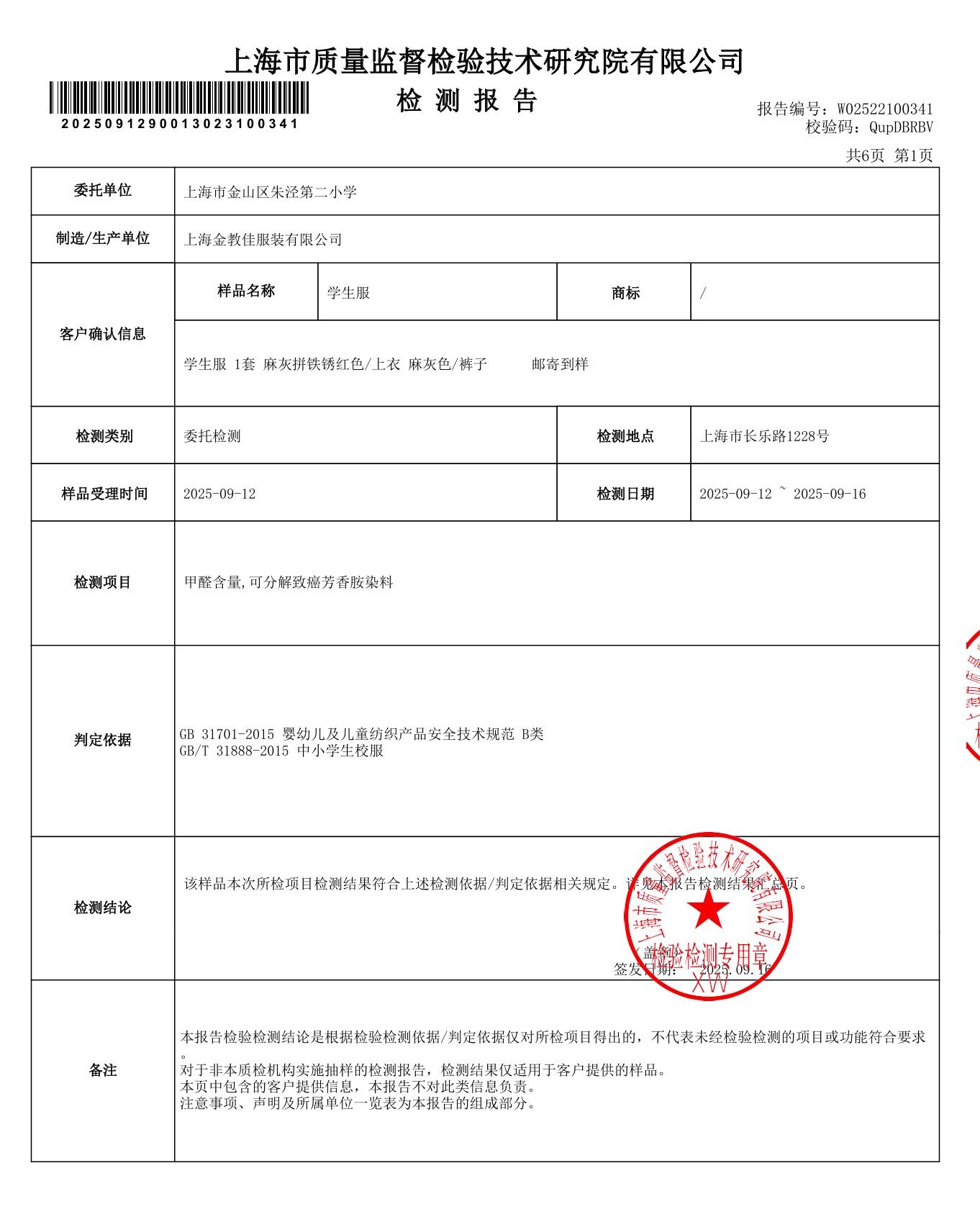 金山区朱泾第二小学2025学年学生校服质检报告公示