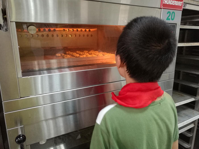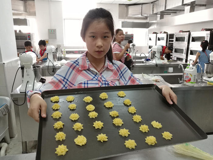 课程指导师夏老师亲自示范了饼干制作的过程。从材料的准备、每一种材料添加的先后顺序、添加的量,到揉合的手法等,夏老师一一给孩子们解说。同学们耐心认真地看完夏老师给的演示后,就迫不及待地开始实践了。当面粉和黄油结合,手上沾满的黄色的面粉让孩子们无所适从,大家在积极询问、互相学习中解决遇到的问题。大家按着顺序一步步添加材料、一次次不断在料理台打圈、糅合,大家不由地感叹:“手好酸!腰好累!”一个多小时的揉捏、装袋、挤花,在这样的体验中深刻体会了烘焙师制作美食的艰辛。当一盘盘大小各异、形状不同的饼干陆续放进烤箱后,大家仔细观察着自己制作的饼干在烤箱里逐渐变色、闻着慢慢飘散出浓浓的香味,劳动的快乐不以言表,工作坊洋溢着同学们的欢声笑语。