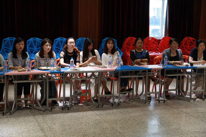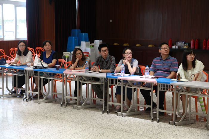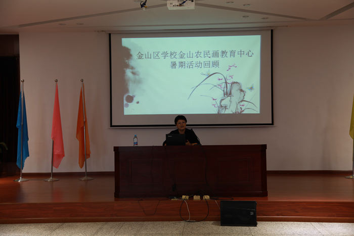 第二个议程是由许育梅老师回顾总结金山区学校金山农民画教育中心暑期活动。许老师回顾了今年暑假有关金山农民画的培训内容。由文房四宝的基础培训开始,到参观金山农民画院、金山农民画村,请教知名的农民画家指导,拜访金山农民画的创始人吴彤章爷爷。还分享了岱山考查的收获与体会,观赏了培训老师创作的金山农民画作品。