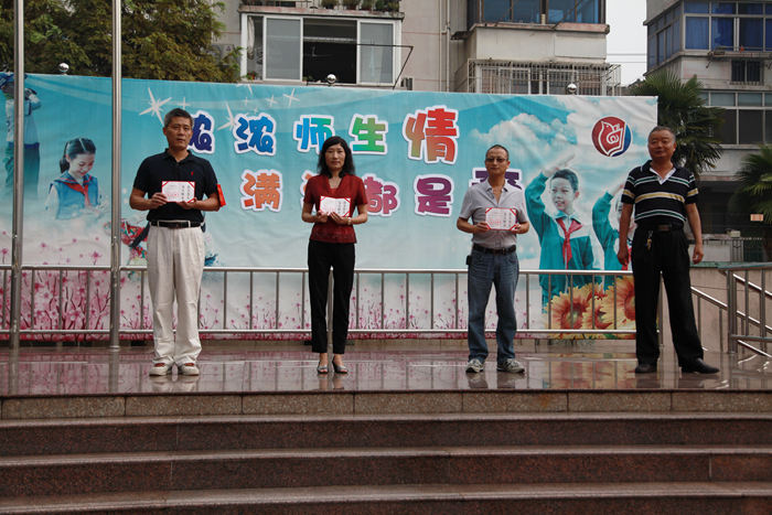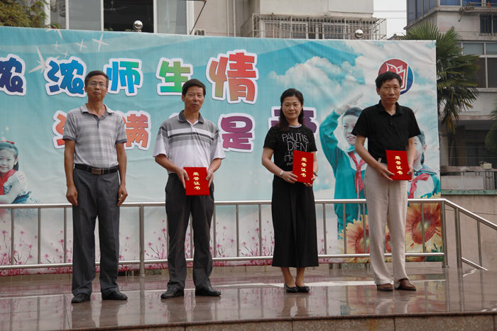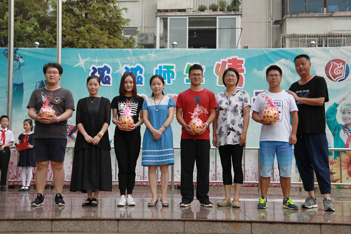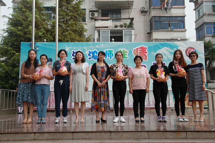 党支部副书记朱保弟老师表彰了朱泾镇“感动教师”,金山区教育系统“爱在身边”十佳人物提名奖,三位优秀园丁上台接受了荣誉证书,和大家一起分享了获奖喜悦。工会主席王春根老师宣读了从教30年的教师名单,三位教师郑重从王老师手中接过奖状,三十年的点点滴滴历历在目,三十年风雨人生,他们呕心沥血,倾情付出,培育了一代代的优秀人才,三十年青葱岁月已过,依然坚守在这个岗位上,默默无闻地付出着。教育需要新鲜血液的注入,今年我们又迎来了一批新教师,他们充满活力,亲切可人。新教师高德鹏的一曲葫芦丝演奏轻快活跃,技巧娴熟。 随后的新教师亮相舞,让全场眼前一亮,新教师们的热情演绎,让全场都沸腾了。为了更好地帮助新教师成长,我们依照传统举行了“师徒结对活动”,徒弟们献上一份寓意“岁岁平安”的小礼物,一个爱的拥抱,相信在师父们的帮助下,这些新教师一定会很快成长起来,成为一名优秀的教师。少先队员代表为老师们献上了饱含深情的诗朗诵《感谢您老师》,让我们再一次感受到了浓浓的师生情。会上,孙翠英校长向全校老师致节日贺词:希望我们的老师多一点微笑,多一份耐心,多一丝宽容,怀一颗童心;希望我们的孩子多一点乖巧,多一份爱心,多一丝认真,怀一颗真心!