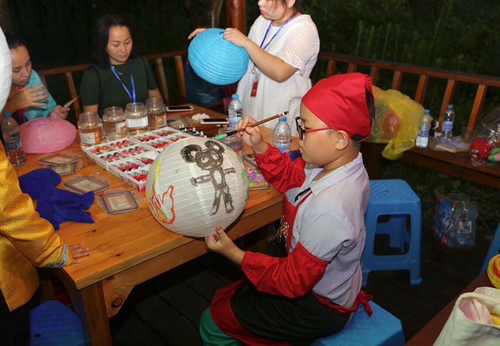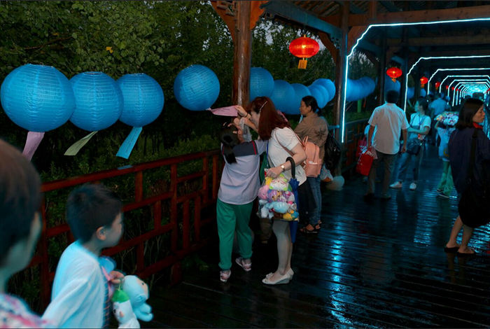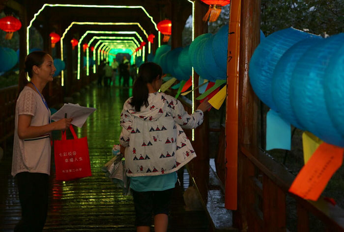 晚上5点30分,中秋活动正式开始了。强丰生态农庄的入口处,500米励志文化长廊布置了百道灯光拱门,不停地变幻着红黄蓝紫七色灯光,形成一个流光溢彩、璀璨炫目的灯光世界,置身其中,仿佛步入时空隧道,如梦如幻。在走廊的两旁,各色灯笼迎风招展,为中秋节平添了一份喜庆。八台古筝整整齐齐的摆放在长廊的入口处,悠扬的古琴声、优美的旋律使人陶醉其中,心旷神怡。5个花灯制作点,志愿者家长、老师、学生教来宾亲手体验花灯制作工艺,花灯小导游为大家介绍朱泾花灯特色。最吸引眼球的当属猜灯谜了,长长的灯谜隧道让游客们猜足了瘾,猜中后,大把大把的礼物捧回家,大家都乐开了怀。